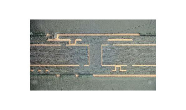 • keine Vertiefungen auf darüber liegende Lagen durch gebohrte und gefüllte Vias in Innenlagen, damit problemlose Realisierung von Fine-Line-Strukturen